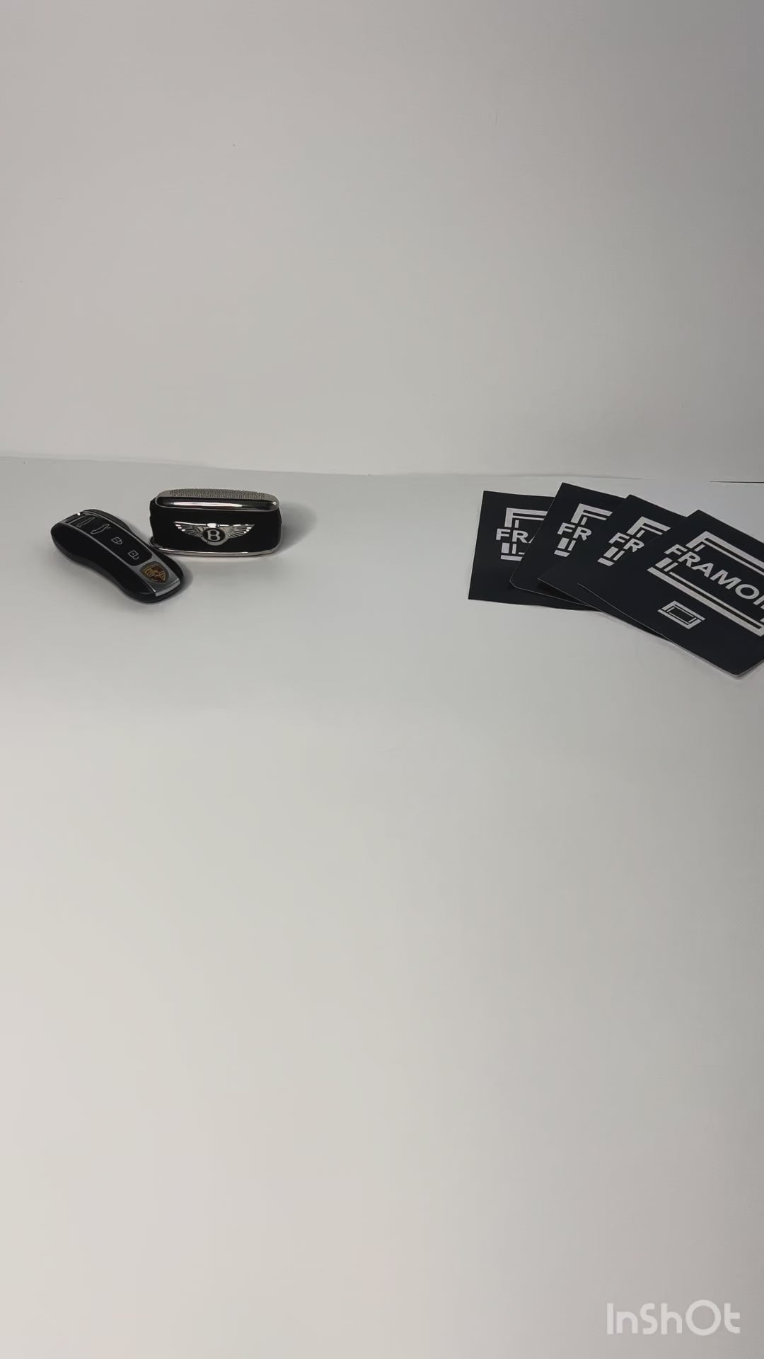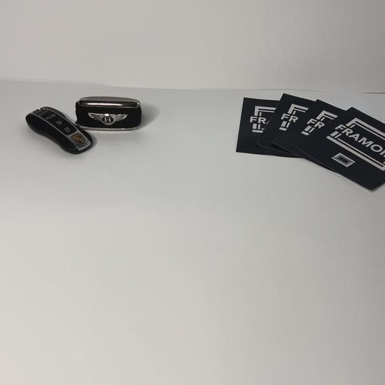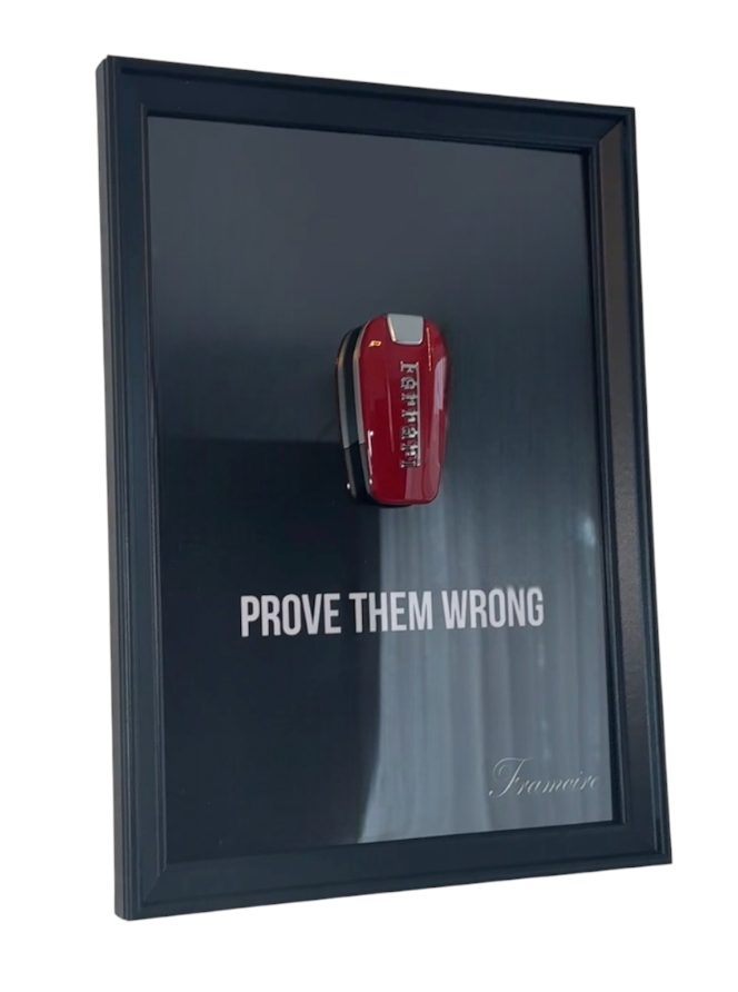 A real 1:1 Ferrari key, framed on a sleek black mirror background.